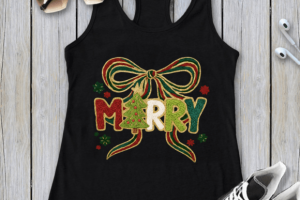 This design features a textured faux-yarn “Merry” lettering paired with a striped coquette bow in classic Christmas tones — red, green, cream, and gold. Perfect for anyone who loves that cozy, homemade look without the hassle of real stitching!