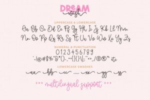 Dream Wish is cute and bouncy font duo. This font is pretty, modern, and fun. It can be used together or separately. Dream Wish duo includes single line script font (with swash) and all caps bold font (with some ligatures).