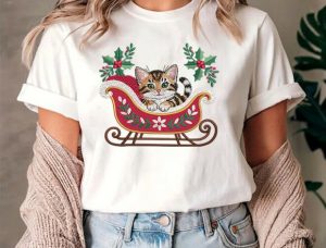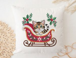 Celebrate the festive season with this adorable embroidery design featuring a cute kitten nestled in a decorative red sleigh adorned with holly. Perfect for holiday-themed garments, home décor, and gift projects.