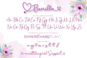 Benilla is a sweet, soft hand-lettered font and monogram. Fall in love with its authentic feel and use it to create gorgeous wedding invitations, beautiful stationary art, eye-catching social media posts, logos, and cute greeting cards. This display font is the perfect choice for making original and outstanding designs. This font is PUA encoded which means you can access all of the heart-themed glyphs and swashes with ease! It also features a wealth of special features including alternate glyphs and ligatures.