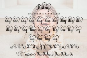 Riday is a romantic and sweet modern calligraphic typeface with characters dancing along the baseline. It will add a splash of luxury to any design project you want to make! This font is PUA encoded which means you can access all the amazing glyphs and binders easily!
