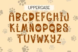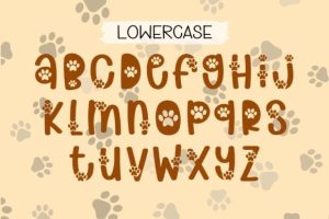 Meet the playful and eye-catching “Dog Paws” font! With its decorative design featuring adorable dog paws, this font exudes a sense of fun and energy, perfect for adding a touch of playfulness to any project related to pets or animals. Its unique style and attractive look make it the ideal choice for packaging, posters, and digital designs that aim to create a lighthearted and engaging atmosphere.