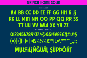 Introducing the Grinch Home Font, a design masterpiece that combines charm, humor, sweetness, and softness in each stroke. This charming typeface is a delicately constructed amalgamation of fun and charm. It exhibits a playful aesthetic that speaks to the heart and tickles the funny bone. The sweet, inviting lettering reveals a soft side that adds warmth and comfort to any design project. Its cute, cuddly characteristics melt hearts, while maintaining impressive readability and versatility. Whether you’re channeling your inner Grinch or simply want a font that brings a smile to your face, the Grinch Home Font is a delightful addition to any designer’s repertoire.