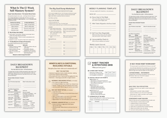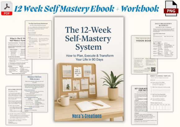 The 12-Week Self-Mastery System is a printable, editable planner designed to help you get more done in 90 days than most do in a year. This is more than a planner—it’s a structured, soulful system that blends goal-setting, habit tracking, mindfulness, and identity work into one life-changing toolkit.