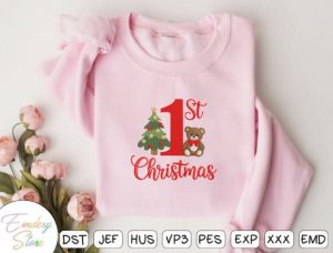 Make baby’s first Christmas extra special with this adorable 1st Christmas Embroidery Design! Featuring a festive Christmas tree, a cuddly teddy bear, and elegant lettering, this design is perfect for baby clothes, onesies, bibs, stockings, pillows, and personalized holiday gifts.