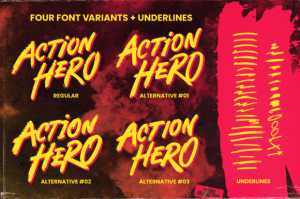 Action Hero is a hand-drawn brush font inspired by action movie posters of the 1980s and 90s. Does your movie feature a hostage situation on a speeding bus or train? Try Action Hero. How about a one-man army tasked with rescuing stranded POWs? Try Action Hero! Maybe a post-apocalyptic race across the desert, or did they dare to kill your favorite second cousin? Big mistake – Get Action Hero!