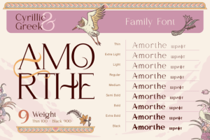 With nine carefully crafted weights, from whisper-thin grace to bold confidence, Amorthe adapts seamlessly to everything from headlines to body text. It balances classic beauty with a fresh, contemporary edge, making it ideal for luxury branding, editorial layouts, and high-end packaging—think fine wine, artisanal chocolates, signature perfumes, and premium skincare.
