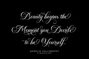 Angelin Calligraphy is attractive because it is sleek, clean, feminine, sensual, glamorous, simple, and very easy to read, thanks to the many luxurious letter connections. The classic style is very suitable to be applied in various formal forms such as invitations, labels, restaurant menus, logos, fashion, makeup, stationery, novels, magazines, books, greeting/wedding cards, packaging, labels, or all kinds of advertising purposes.