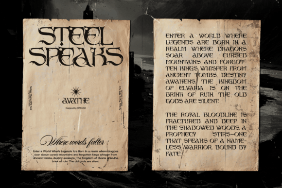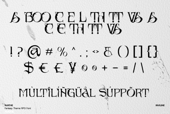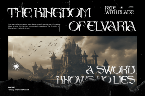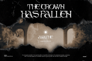 Avathe is a fantasy-themed display font inspired by the dramatic elegance of gothic lettering and medieval scripts. With sharp ornamental serifs, dark curves, and an ominous tone, Avathe brings a bold and mysterious character to every design. Perfect for RPG game titles, black metal band logos, book covers, and movie posters, this font captures the essence of ancient legends and dark magic. Each letter is crafted with flair, making it ideal for projects that seek to evoke intensity, mysticism, and epic fantasy narratives. Whether you’re designing for a fantasy role-playing campaign or branding a gothic fashion line, Avathe delivers an unforgettable impact.