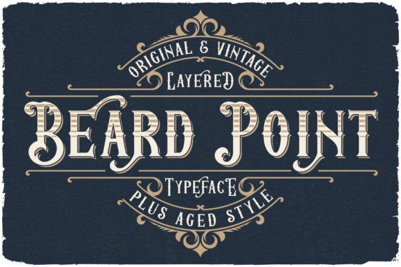 Introducing vintage label font named Beard Point. This font family has an additional characters and multilingual support (check out all available characters on preview). The font family has six styles: Regular, Shadow, Texture, Shadow FX, Texture FX, Aged. This font will look good on any vintage styled designs like a poster, T-shirt, label, logo, etc.