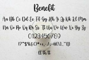 Benefit is a sweet and cursive handwritten font. This gentle font will look gorgeous on a variety of design ideas. It will add a joyful and romantic touch to each of your projects! Perfectly fit for branding, logo, wedding things, greeting cards, fashion, lookbook, marketing promotion, and any time you want your design to look fancy and elegant but still casual.