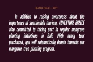 Introducing Blonden: A condensed sans-serif font that fuses modernity with streamlined efficiency. Blending style and compactness, Blonden brings a dynamic edge to any design. Experience the sleek versatility of Blonden’s condensed form, perfect for making bold statements in tight spaces.