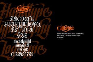 California is a bold and thick lettered blackletter font. Add it confidently to your projects, and you will love the results.