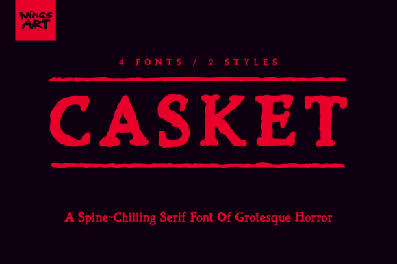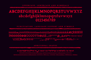 The Casket font family includes a complete set of uppercase and lowercase characters, along with numerals, punctuation, symbols and language support. It also comes with a blood-soaked variant (for adding ghoulish details), each featuring a complete set of alternatives so you’ll never have to repeat characters, thus maintaining that all-important analogue look.