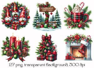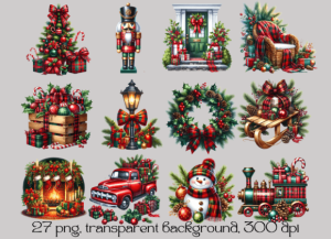 Get ready to deck the halls with this classic collection of 27 traditional green and red Christmas decorations! From Santa Claus and the Nutcracker to a festive Christmas tree, sleigh, snowman, lantern, and cozy fireplace, this set brings the timeless holiday spirit right into your designs. Each piece is richly detailed, capturing the warmth and charm of Christmas.