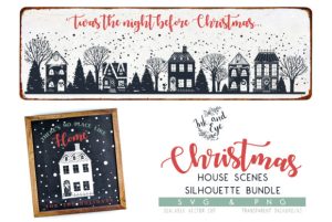 Christmas Winter House Silhouette Street Scene Clipart set includes five unique Christmas House Silhouettes, four winter trees, light posts, mailboxes, holly and bow, snow overlay and snowy ground element. Set also includes a full street scene in greyscale, one in PNG format, two in SVG format (flattened and editable options)