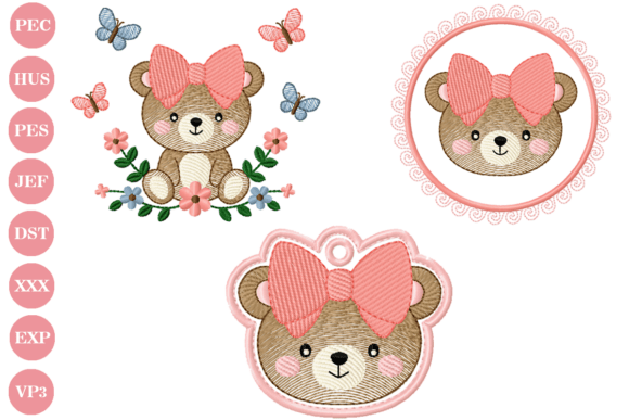 The design features a lovely teddy bear with a big bow, delicate floral details, and playful butterflies. Each stitch is carefully digitized to give a professional finish, making it perfect for kids’ items, baby shower gifts, and cute decorative pieces.