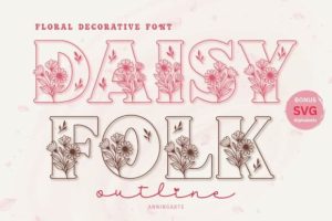 Daisyfolk Outline is a floral decorative serif font featuring uppercase A–Z and numbers 0–9, beautifully adorned with hand-drawn daisy and botanical illustrations. This outlined version brings a fresh, lightweight aesthetic that’s perfect for spring-themed designs, boho weddings, greeting cards, DIY crafts, and Cricut projects.