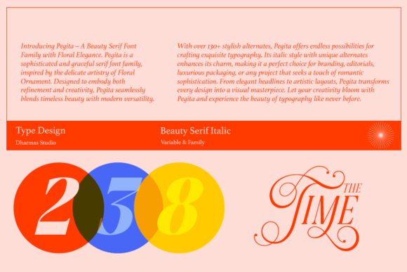 DH Pegita is a refined serif display font inspired by the delicate beauty of floral ornaments. Designed for both sophistication and modern charm, this typeface blends classic aesthetics with contemporary versatility, making it perfect for high-end design projects.