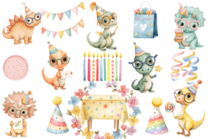 Bring prehistoric fun to your celebration designs with this adorable watercolor dinosaur birthday clipart set! Featuring cute baby dinos, T-Rex, party hats, balloons, banners, cakes, volcanoes, and jungle leaves — perfect for first birthdays, party invitations, nursery prints, kids’ room decor, and Jurassic-themed projects.