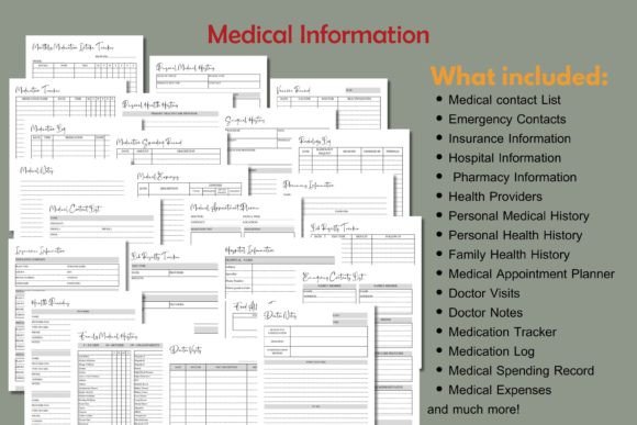• Medical contact List • Emergency Contacts • Insurance Information • Hospital Information • Pharmacy Information • Health Providers • Personal Medical History • Personal Health History • Family Health History • Medical Appointment Planner • Doctor Visits • Doctor Notes • Medication Tracker • Medication Log • Medical Spending Record • Medical Expenses • Vaccine Record • Surgical History • Lab Results Tracker • Medical Notes • Radiology Log • Monthly Medication Intake Tracker • Food Allergy Tracker