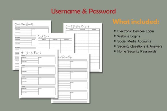 • Electronic Devices Login • Website Logins • Social Media Accounts • Security Questions & Answers • Home Security Passwords