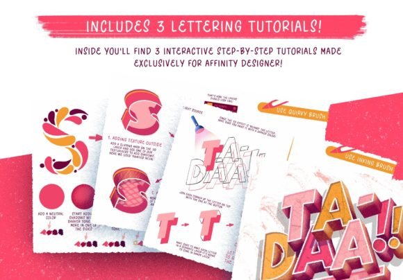 Additionally, we’ve included a Step-by-Step Lettering Tutorials made exclusively for its use on Affinity Designer (both iPad & Desktop). You will learn our method on how to add textures and apply shadows to your letters. Plus, it’s super fun to follow!