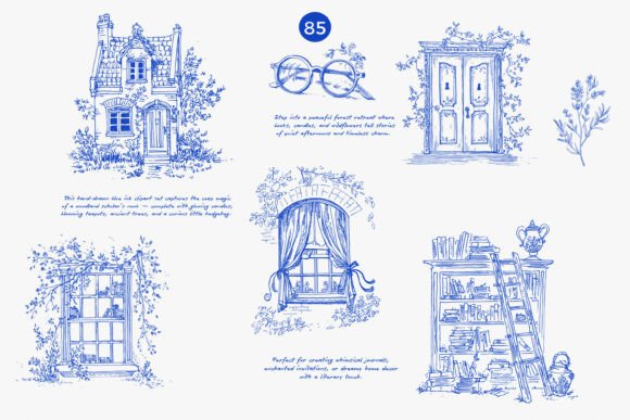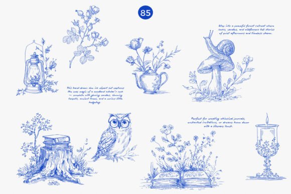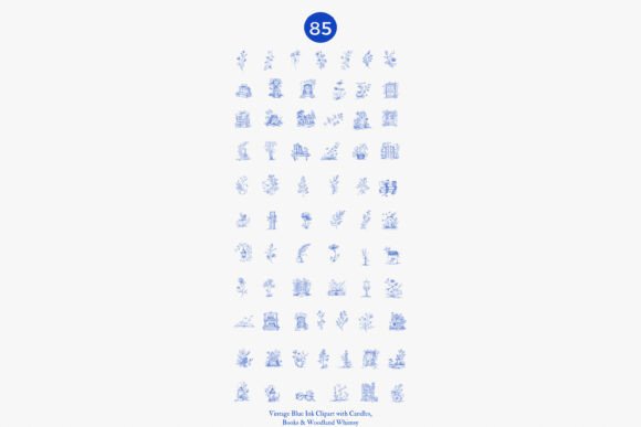 A charming vintage clipart collection of woodland animals, books, and nature details, all in blue ink style. This png illustration set includes 85 whimsical elements like owls, deer, rabbits, candles, and books—perfect for creating bookish clipart designs or magical forest scenes.
