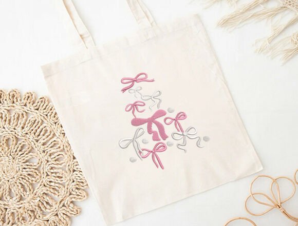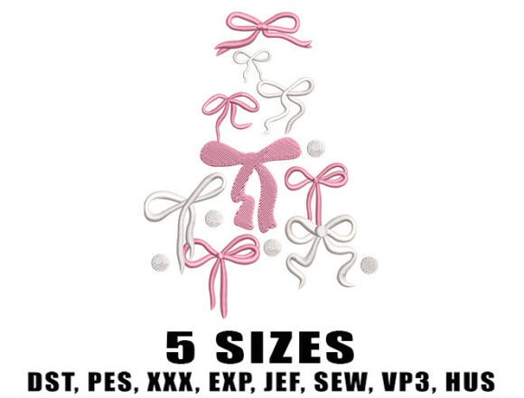 This elegant design mimics the shape of a Christmas tree made entirely from bows in soft pink and white tones, with dotted accents. A minimalist and graceful option for sophisticated holiday crafts and garments. Provided in 5 sizes and common embroidery formats.