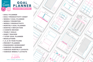 The goal planner Canva templates include a goal tracker, checklist, daily planner, and more! This goal-setting template bundle will help you formulate your ideal goal sheet, and help you to achieve your goals! You can use this nifty editable template for planner printable creation. The Canva planner template design comes in shades of green and terracotta, but you can change everything in these templates from fonts, colors, elements, shapes, layouts, and more! All you need is a free Canva account!