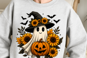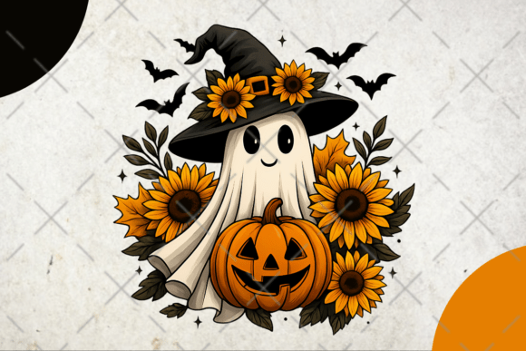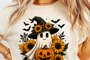 Halloween Cute Ghost PNG | Sunflower Ghost PNG | Pumpkin & Witch Hat PNG | Spooky Season Sublimation Design