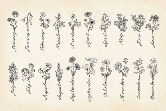 This digital download set includes 24 minimalist birth month flowers with the name of the month, perfect for a wide range of creative projects such as birthday, wedding, greeting cards, Mother’s Day cards, planner layouts, web decorations, scrapbook, or sublimation print on demand products such as mugs, phone cases, paintings, journals, T-shirts, mousepads or tote bags. They look great with any background and can be easily customized and incorporate into your designs.