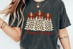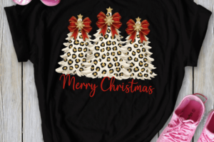 This stylish Christmas design features three chic white trees with leopard print patterns, topped with luxurious red bows, golden stars, and sparkling snowflake accents — paired with an elegant “Merry Christmas” script. Perfect for creating fashionable holiday shirts, mugs, tote bags, wall art, cards, or print-on-demand products.