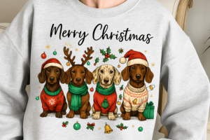 🐾 Features 4 cute dachshund dogs in festive outfits