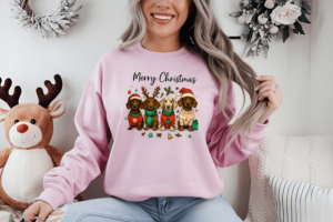 This festive design features four cute dachshunds dressed in cozy Christmas sweaters, scarves, and Santa hats — surrounded by ornaments, bells, and holly. Perfect for pet lovers and dog moms who adore cozy, heartwarming holiday art.
