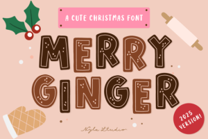 Merry Ginger is a cute gingerbread decorative font. Perfect for Christmas projects, card, shirts, retro designs, Christmas invitations, mugs, stickers, playful quotes, creating posters, logos, greeting cards, packaging, decorating the illustration and so much more!