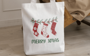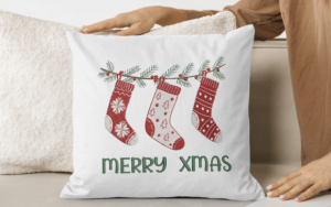 This festive design features three red holiday socks hanging from a pine branch decorated with berries, and the text “MERRY XMAS” stitched below — a perfect symbol of warmth, coziness, and Christmas joy.