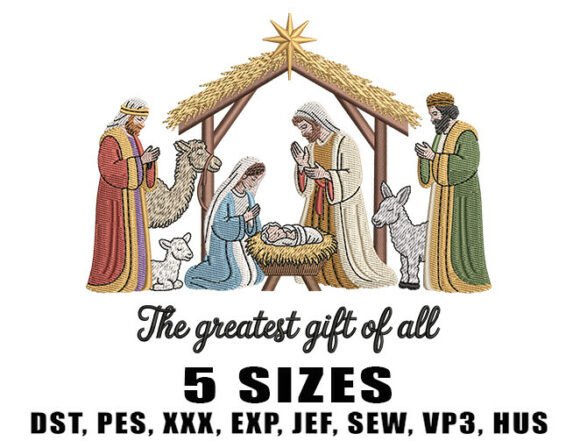 Celebrate the true meaning of Christmas with this detailed nativity embroidery design, featuring Mary, Joseph, baby Jesus, and the three wise men. Includes 5 sizes and multiple machine formats.