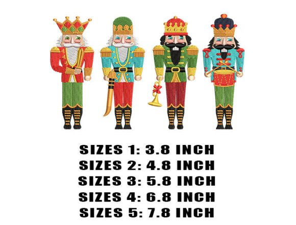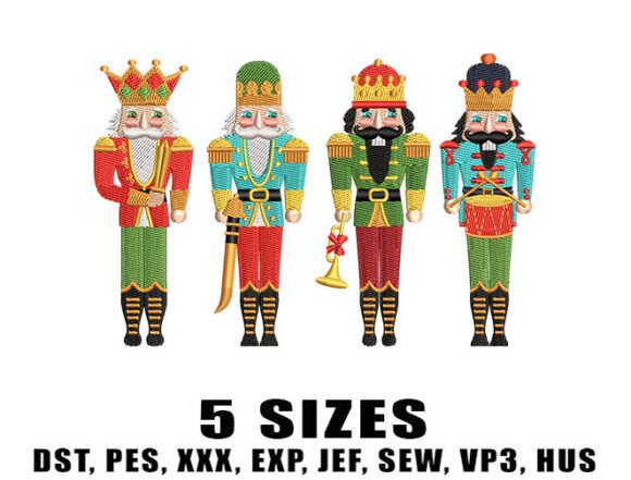 Add a royal touch to your holiday projects with this Regal Nutcracker Kings embroidery design. Featuring four intricately detailed nutcracker kings in traditional festive outfits, this design is ideal for holiday home decor or apparel. Available in 5 sizes and formats including DST, PES, XXX, EXP, JEF, SEW, VP3, and HUS.
