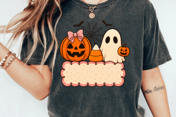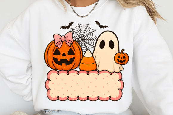 Bring a touch of cute and spooky charm to your Halloween projects with this Personalized Kids Ghost Pumpkin Halloween Girl PNG. Featuring an adorable ghost, a pumpkin with a pink bow, candy corn, and a blank label area, this design is perfect for adding custom names or messages.