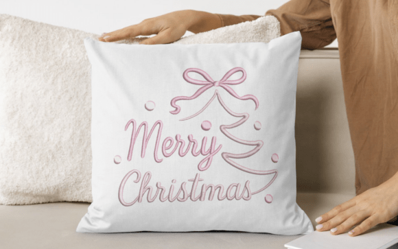 The graceful satin lines form a stylized Christmas tree crowned with a bow, perfect for sweatshirts, tote bags, baby outfits, napkins, or festive decor.