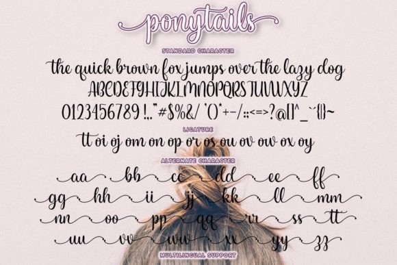 Ponytails is a stylish and incredibly elegant handwritten font. It looks stunning on wedding invitations, thank you cards, quotes, greeting cards, logos, business cards, and every other design which needs a handwritten touch. This font is PUA encoded, which means you can access all of the glyphs and swashes with ease!