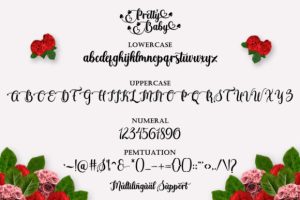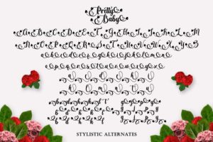 Pretty Baby is a romantic and sweet calligraphy typeface with characters that dance along the baseline. It will add a luxury spark to any design project that you wish to create! This font is PUA encoded which means you can access all of the amazing glyphs and ligatures with ease!