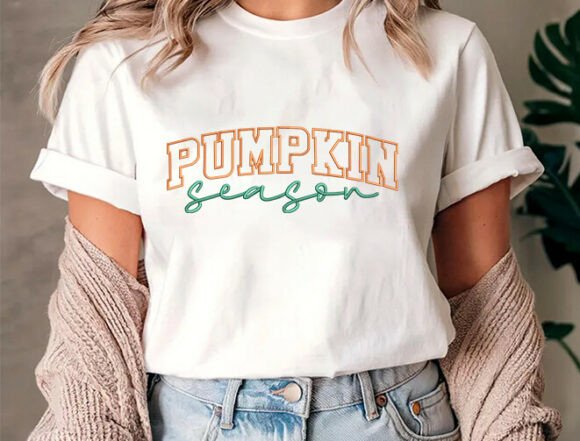 This appealing embroidery design combines two contrasting text styles to create the phrase “PUMPKIN Season.” The word “PUMPKIN” is rendered in a prominent, arched block font with an orange outline and a white fill, giving it a classic collegiate look. Below it, the word “Season” is written in a graceful, flowing teal script font, adding a touch of elegance and softness.