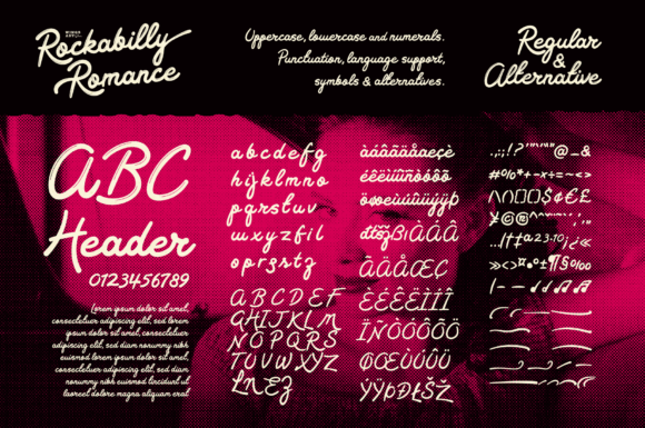 Rockabilly Romance is a rebellious script font inspired by 1950s Americana. It’s designed to evoke the feel of bustling retro diners, drive-in movies and features a Rock ’n’ Roll attitude. This font is PUA encoded which means you can access all glyphs and swashes with ease!