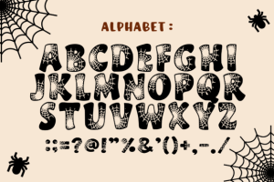 Introducing Spider webs – a charming and spooky decorative font that will add a playful touch to designs aimed at children. Enhance the charm of your creations – be it unique t-shirt prints, adorable baby clothes, nursery decor, charming digital designs, fun cards and more. This font combines creativity and fun into a font that transforms your designs into works of art! Feel the magic it brings, injecting life and joy into every design it touches. Embrace the extraordinary; explore the wonders of the Spider webs font!