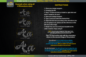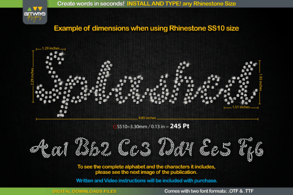 This is a very cool Rhinestone template Splashed Script font that will let you create words in seconds! In addition, when you type, each letter is filled perfectly with rhinestones or arranged and trapped for heat transfer vinyl so you can conveniently customize your designs with text.