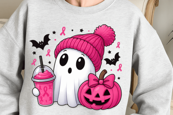This cute and trendy design features a ghost in a pink beanie, a pumpkin with a bow, and a pink drink adorned with awareness ribbons—perfect for shirts, mugs, tumblers, tote bags, stickers, and digital projects. Its mix of Halloween vibes and breast cancer awareness makes it ideal for seasonal campaigns, fundraising, or personal projects.