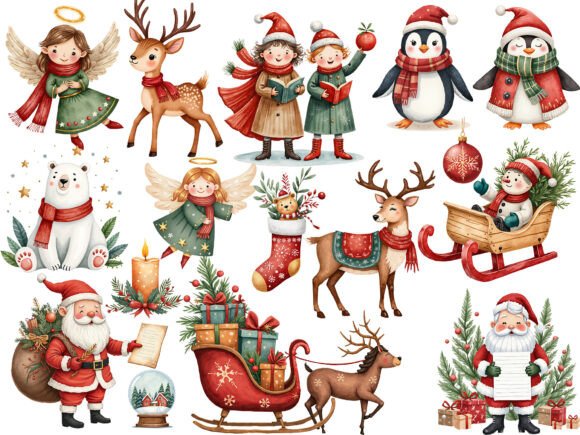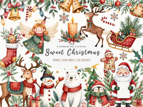 This collection includes: 70 elements, Sweet cute Christmas mrs Santa Claus and animal png Bundle, Winter arctic animals polar bear png, Christmas angel png, Bundle winter wreath, Christmas angel png, cute santa png, reindeer clipart, snowman polar bear, bundle winter wreath, winter woodland png, mrs santa claus png, snowman clipart, Christmas floral png, Santa village clipart, Christmas png bundle, sweet Christmas png, arctic animals