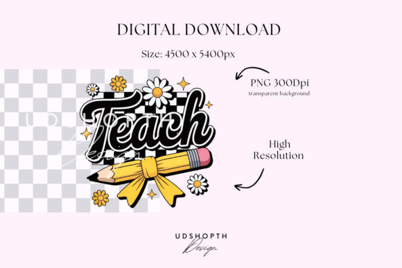Celebrate your love for teaching with this adorable Teach PNG Design! This high-resolution digital artwork features bold hand-lettered “Teach” text, paired with a cute yellow pencil tied with a bow, cheerful daisies, and a fun black-and-white checkered background—perfect for sublimation on teacher shirts, tote bags, mugs, and more.